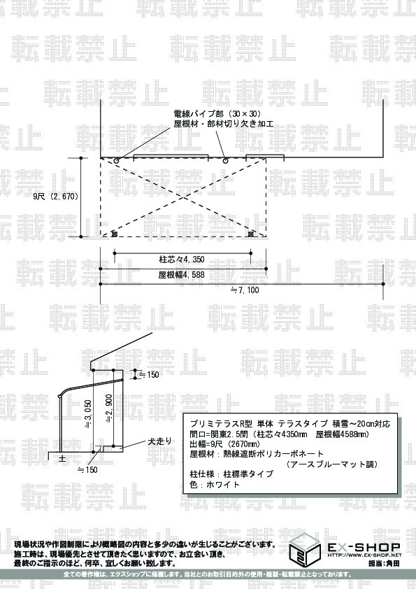 サイズ | 柱芯々 4,350mm 屋根幅 4,588mm 出幅 2,670mm |