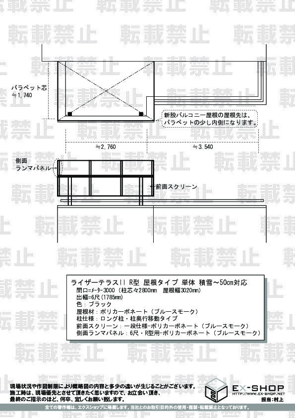 サイズ | 柱芯々 2,800mm 屋根幅 3,020mm 出幅 1,785mm |