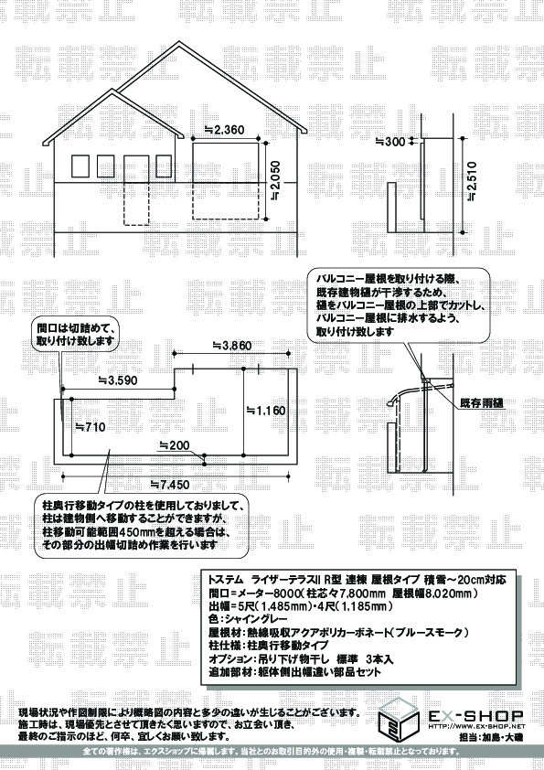 サイズ | 柱芯々 7,800mm 屋根幅 8,020mm 出幅 1,485mm |