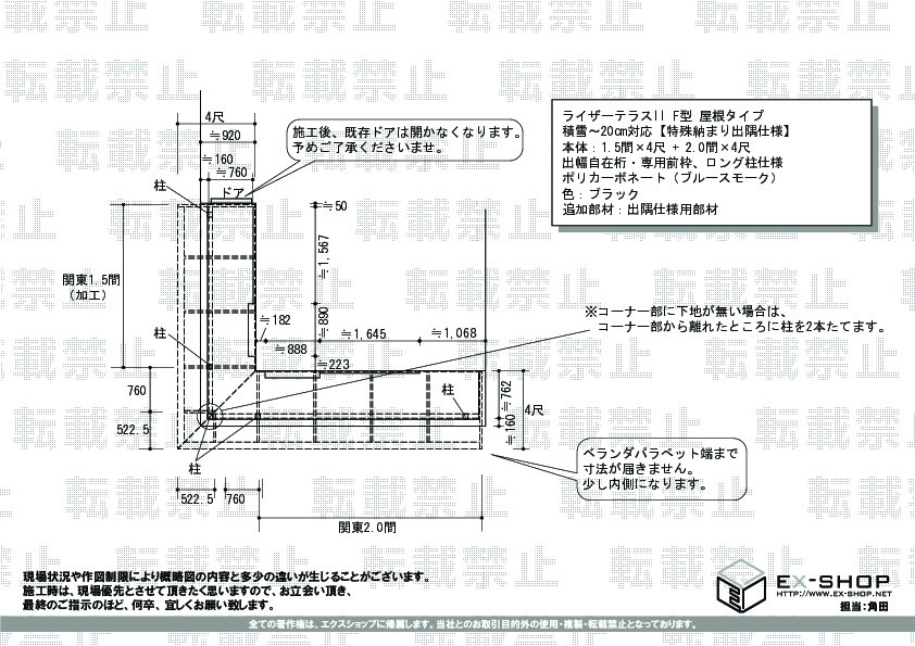 二階バルコニー屋根の見事な出隅加工タイプのお写真、有難うございました!斜めに走った垂木がまさに職人技でお写真を拝見しては、惚れぼれしております。また機会がございましたら、ぜひエクスショップをご利用くださいますよう、宜しくお願い致します。