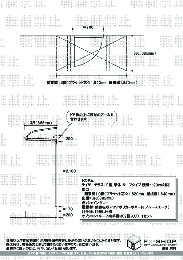 | サイズ | ブラケット芯々 1,820mm 屋根幅 1,840mm 出幅 885mm |