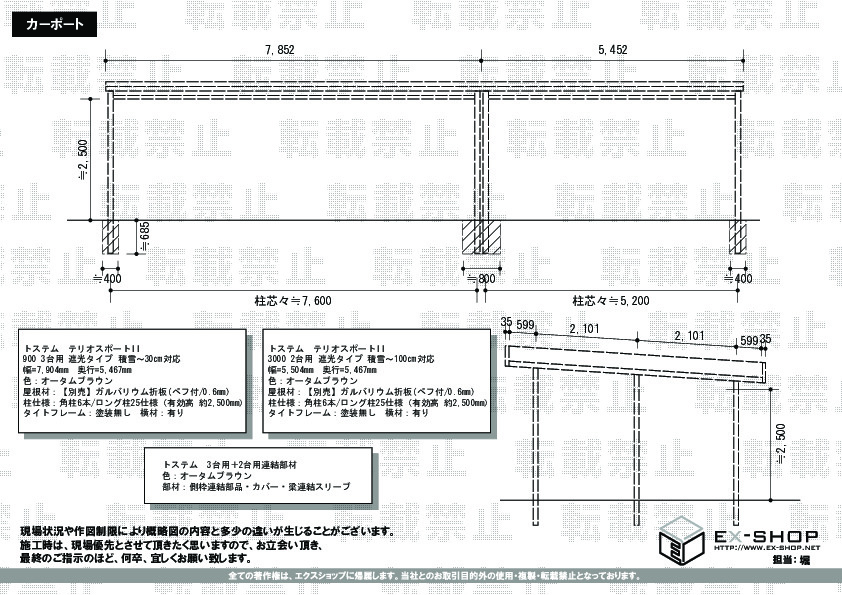 | 屋根高等 | 角柱6本/ロング柱25仕様(有効高 約2,500mm) |