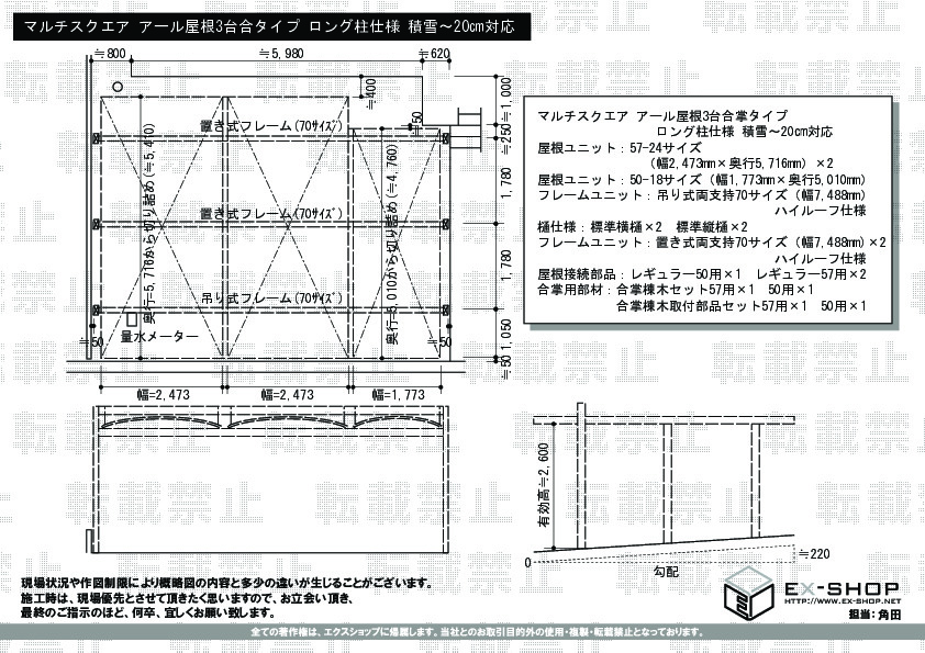 マルチスクエア アール屋根3台合掌タイプのご利用で、3台のお車をすっきりと止めることのできるカーポートが設置できましたこと、大変嬉しく存じます。シャイングレーのフレーム材で、全く圧迫感のない納まりぐあいになったのではと思います。今後も絶えず企業努力を続け、お客様窓口のレベルを上げていけるよう、努めてまいります。また機会がございましたら、ぜひエクスショップをご利用頂けますよう、宜しくお願い致します。この度のご利用、誠に有難うございました。