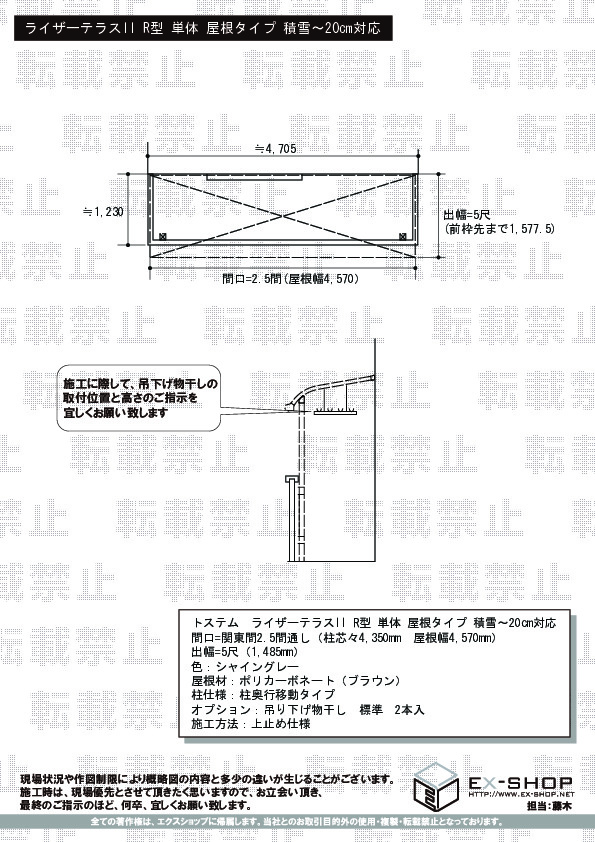 | サイズ | 屋根幅 4,570mm 出幅 1,485mm |