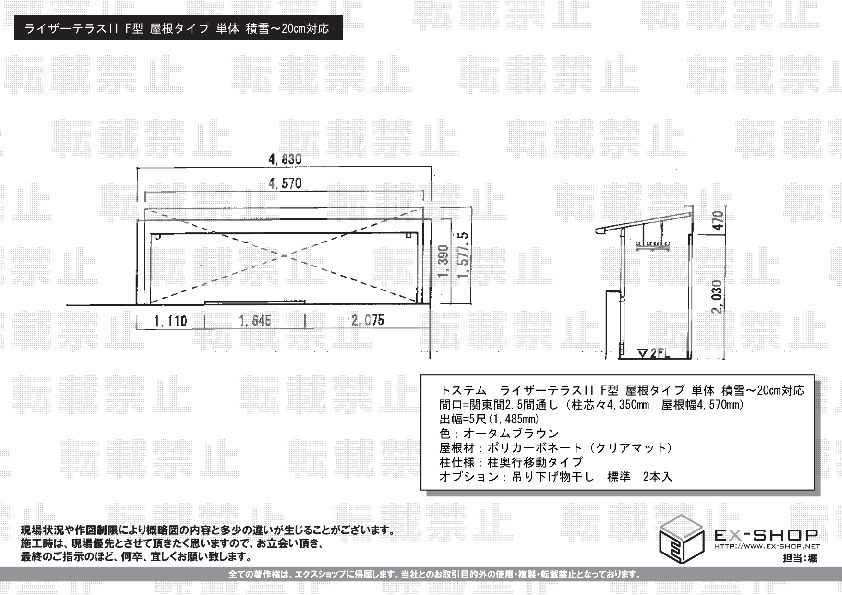 | サイズ | 屋根幅 4,570mm 出幅 1,485mm |