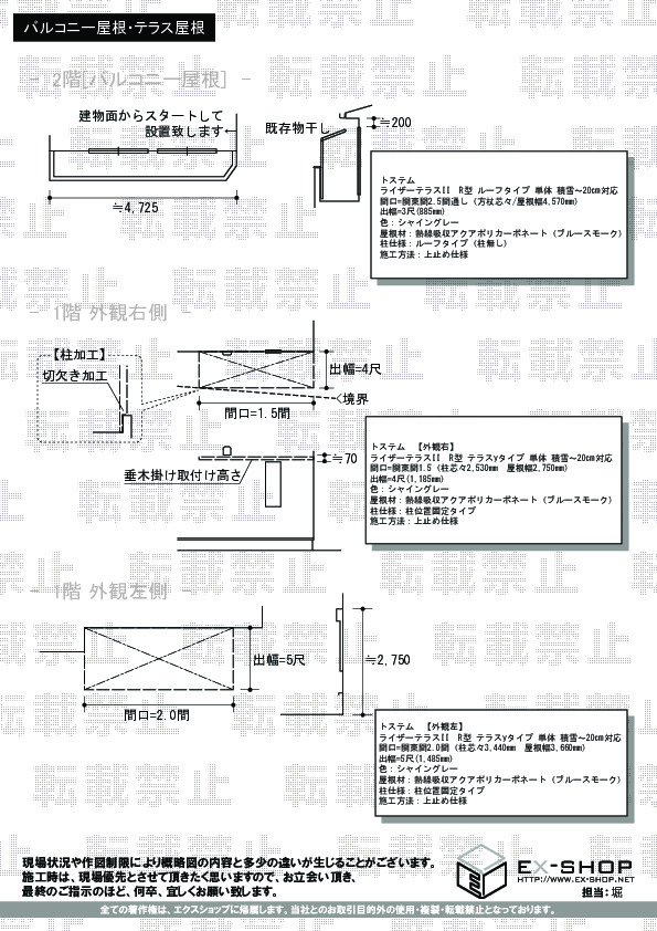 サイズ | 屋根幅 4,570mm 出幅 885mm |