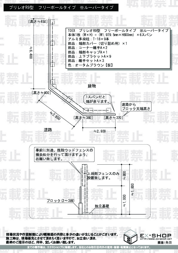 この度はプリレオR9型フェンスの施工をご依頼頂きまして、誠に有難うございます。ルーバータイプのフェンスは、外からの視線はカットしながら、風は通しますので、都会的な生活には最適なフェンスだと存じます。既存の、メッシュフェンスとの調和も良く、お客様のご自宅の外観を損なうことなく、施工できましたこと大変嬉しく存じます。提携施工店との連絡は、弊社が責任を持って行っておりますので、ご不便を感じられたとのこと、大変申し訳なく思っております。今後は、窓口対応のスキルアップを図り、全てのお客様に安心してご利用頂けるエクスショップを目指して参りたいと存じます。この度のご利用、誠に有難うございました。