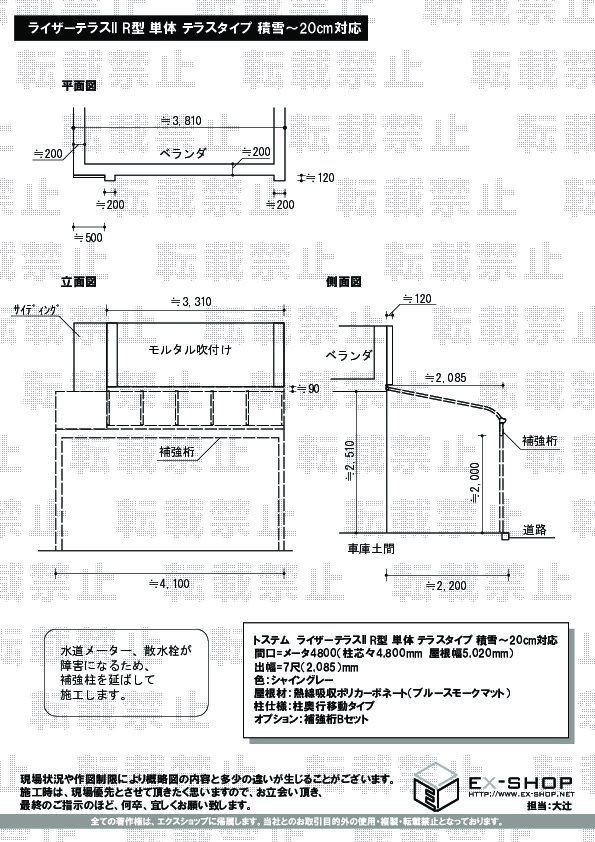 サイズ | 柱芯々 4,800mm 屋根幅 5,020mm 出幅 2,085mm |