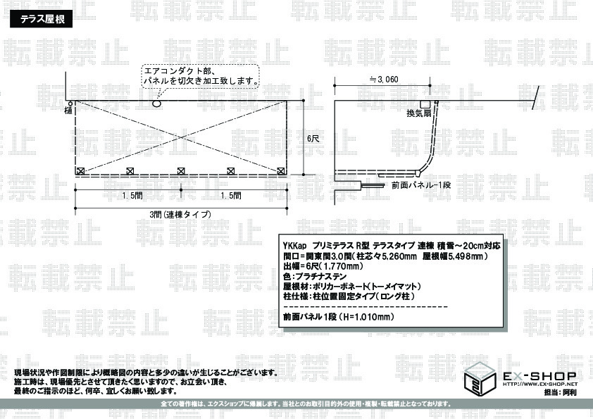 サイズ | 柱芯々 5,260mm 屋根幅 5,498mm 出幅 1,770mm |