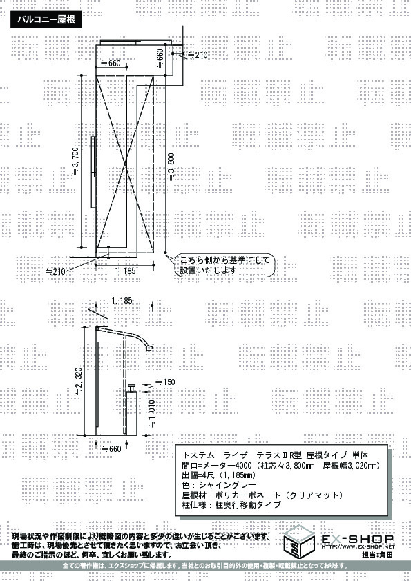 | サイズ | 柱芯々 3,800mm 屋根幅 3,020mm 出幅 1,185mm |