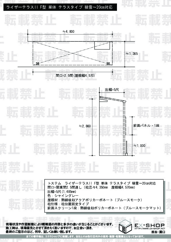 サイズ | 柱芯々 5,260mm 屋根幅 5,480mm 出幅 1,485mm |