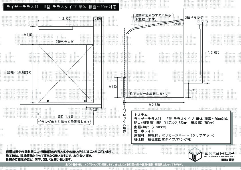 サイズ | 屋根幅 2,750mm 出幅 2,985mm |