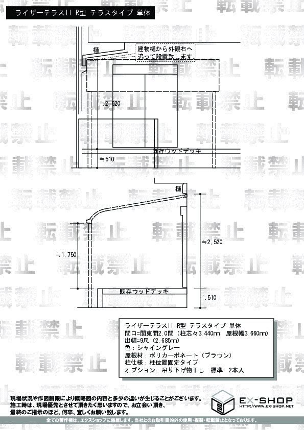 | サイズ | 柱芯々 3,440mm 屋根幅 3,660mm 出幅 2,685mm |