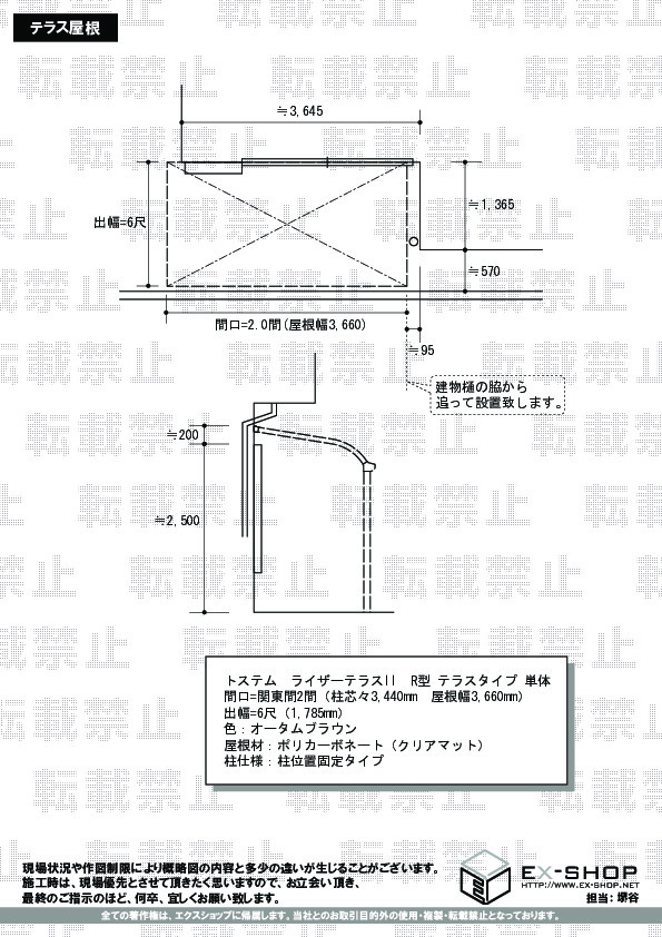 サイズ | 柱芯々 3,440mm 屋根幅 3,660mm |