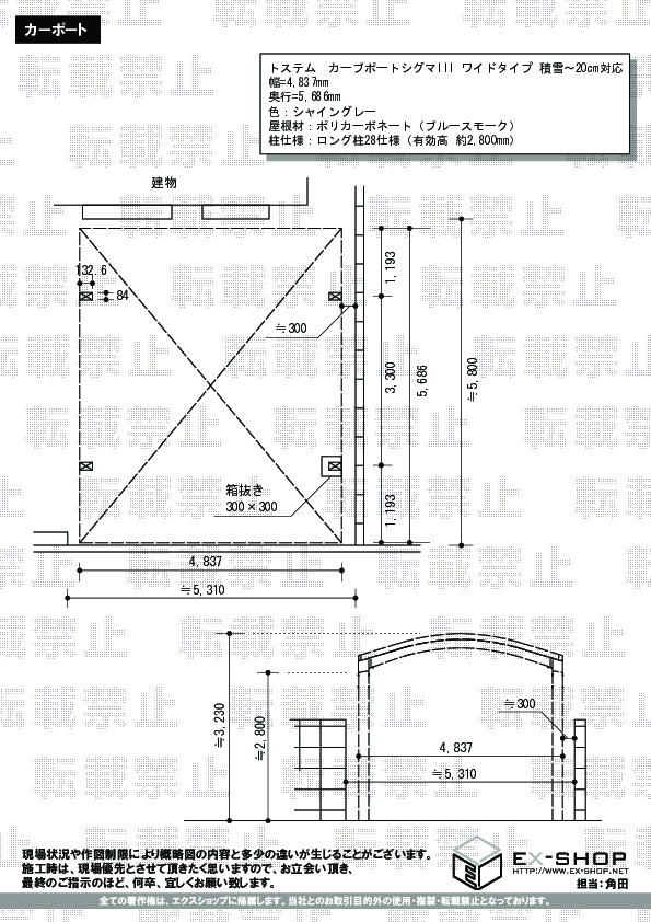 | 屋根高等 | ロング柱28仕様(有効高 約2,800mm) |