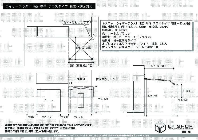 サイズ | 柱芯々 2,530mm 屋根幅 2,750mm 出幅 2,385mm |