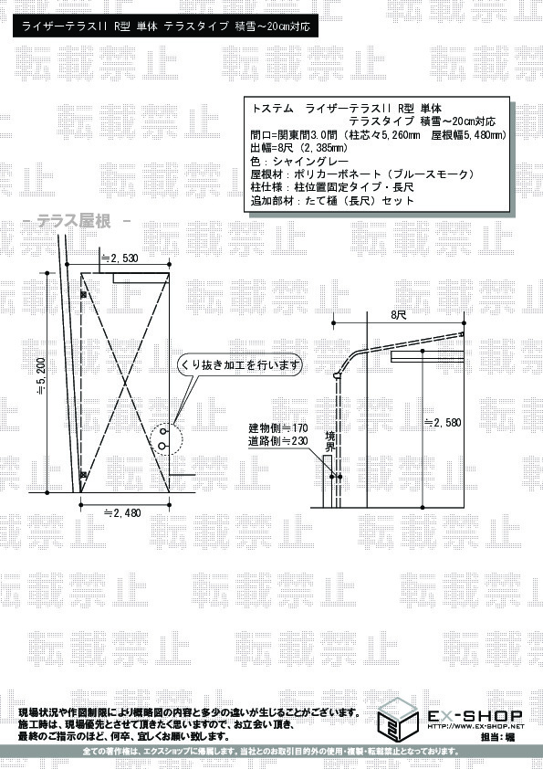 サイズ | 柱芯々 5,260mm 屋根幅 5,480mm 出幅 2,385mm |
