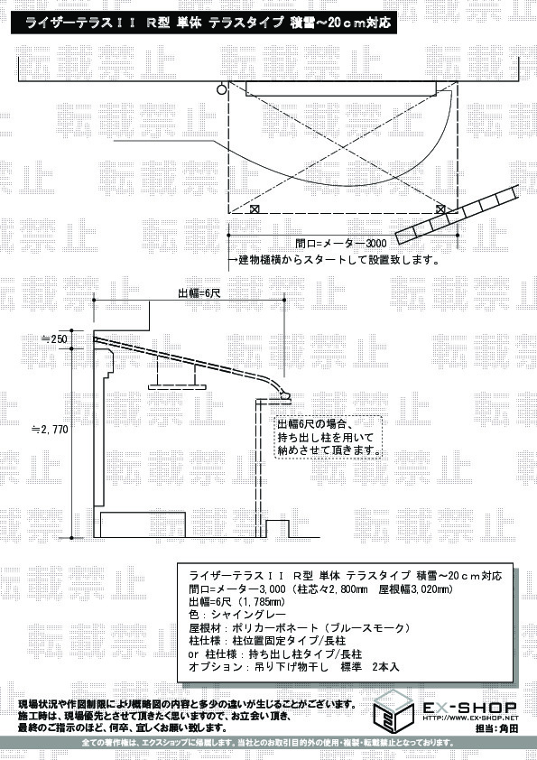 サイズ | 柱芯々 2,800mm 屋根幅 3,020mm 出幅 1,785mm |
