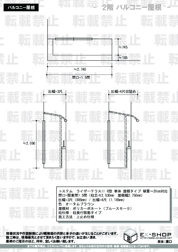 サイズ | 柱芯々 2,530mm 屋根幅 2,750mm 出幅 1,185mm |