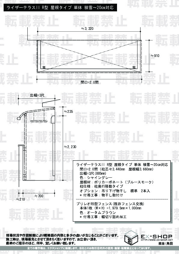 サイズ | 屋根幅 3,660mm 出幅 885mm |