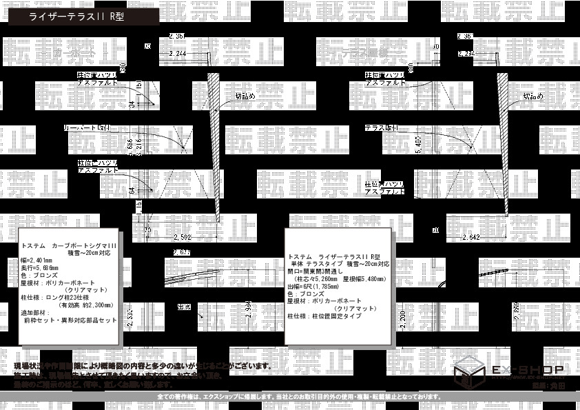 サイズ | 柱芯々 5,260mm 屋根幅 5,480mm 出幅 2,685mm |