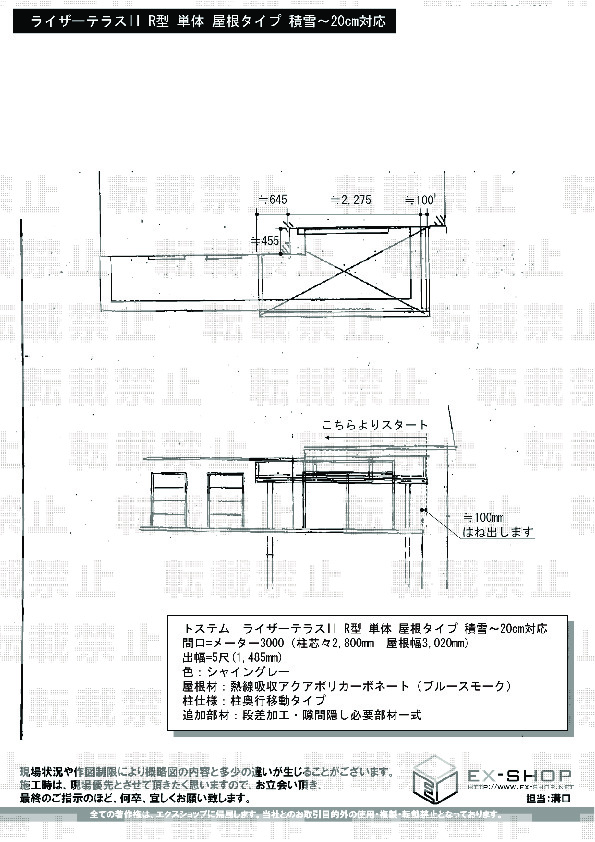 | サイズ | 柱芯々 2,800mm 屋根幅 3,020mm 出幅 1,485mm |
