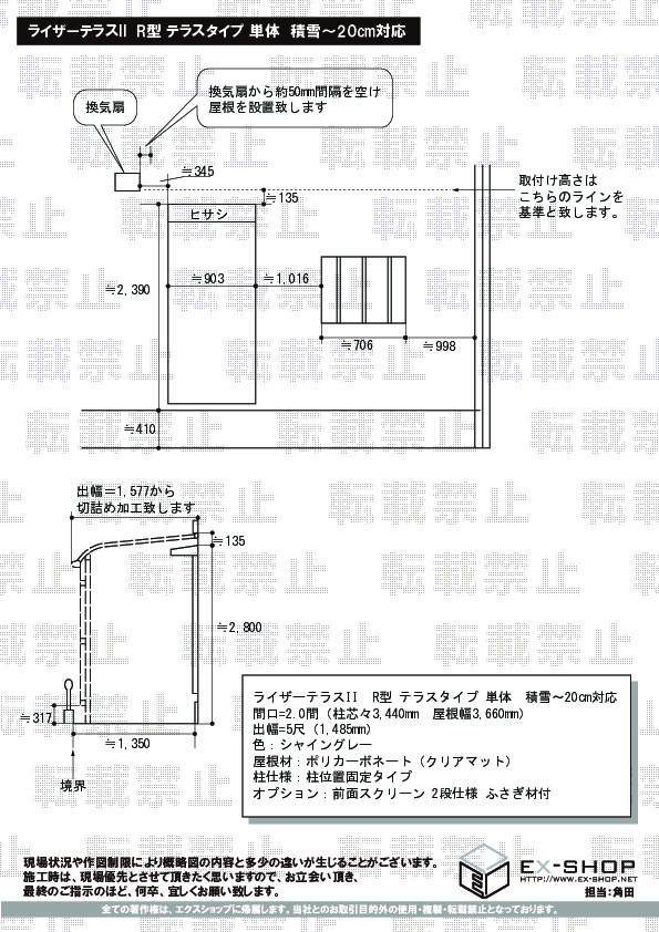サイズ | 屋根幅 3,660mm 出幅 1,485mm |