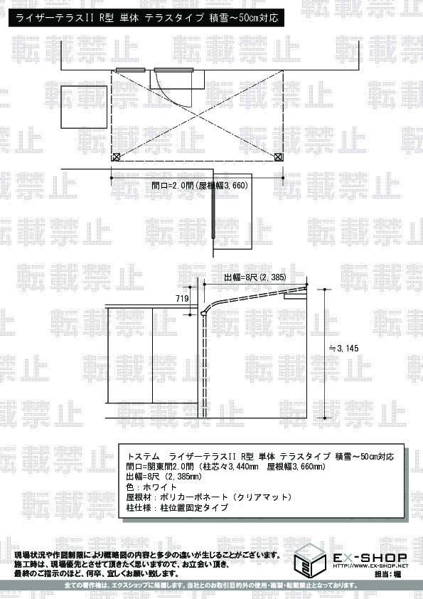 サイズ | 柱芯々 3,440mm 屋根幅 3,660mm 出幅 2,385mm |