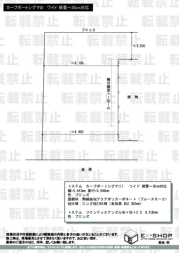 幅=3,624mm 奥行=5,686mm 色:シャイングレー 屋根材:ポリカーボネート(クリアブラウン) 柱仕様:標準柱仕様(有効高 約2,200mm)