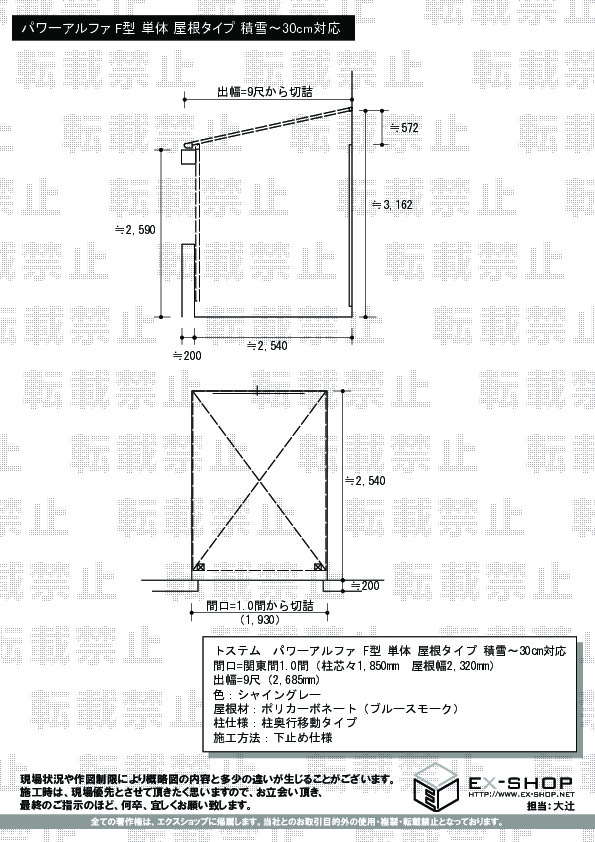 | サイズ | 屋根幅 2,320mm 出幅 2,685mm |