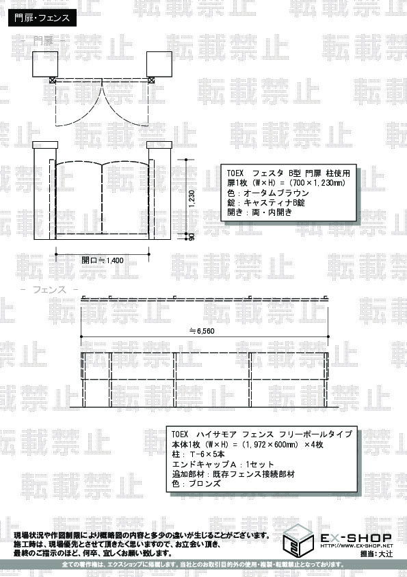 経年劣化のブロック塀修復に伴い、フェンスを新たにたてる事となり、元々の依頼業者の見積もりが高かったため、ネットで(当初、不安ではあったが)エクスショップを見つけ、メールやtelでの対応が早くて感じ良かったので、商品(フェンス)のみ購入。そのフェンスが安価だったにもかかわらず、商品がとてもしっかりしていて満足したので、追加でリピート購入として門扉(工事込み)も申し込んだ。現地調査や施工日程についてもこちらの希望にそってくれて、出来上がりも完璧!商品、施工共に大満足!。
