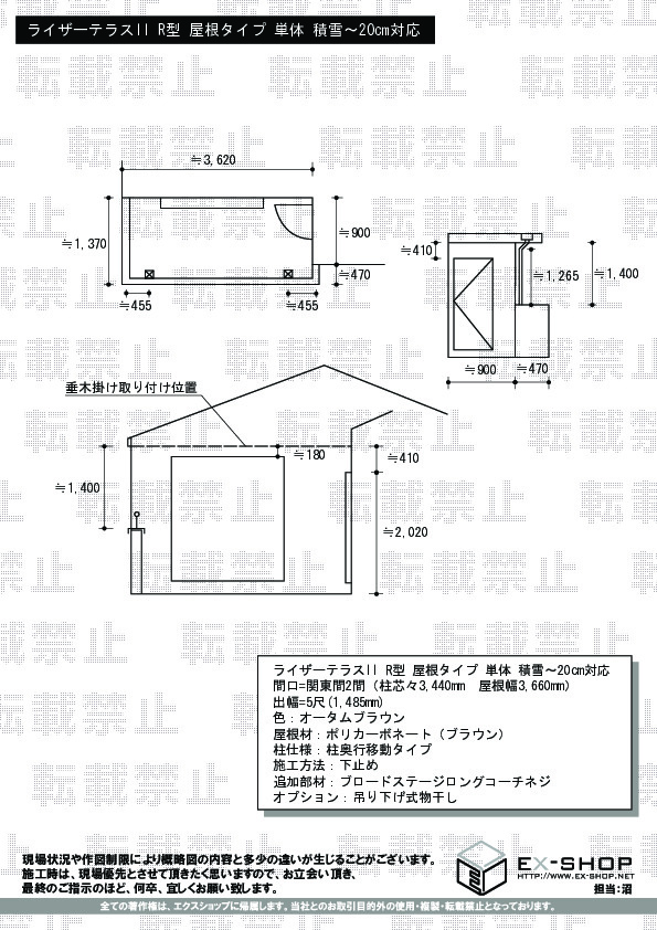 | サイズ | 屋根幅 3,660mm 出幅 1,485mm |