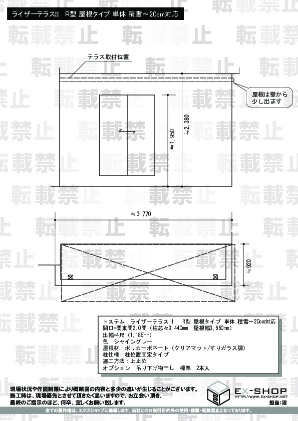 サイズ | 屋根幅 3,660mm 出幅 1,185mm |