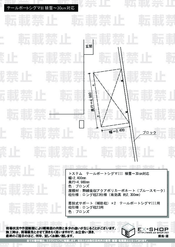 この度は、テーポートシグマIIIの施工をご依頼頂きまして、誠に有難うございました。屋根材の件では、ご迷惑をおかけして申し訳ございませんでした。屋根材交換の際は快くご協力頂き、誠に有り難うございました。また、取扱説明書ならびに保証書の送付が遅れ、ご迷惑をおかけ致しました。今後は、更にご満足頂けるエクスショップを目指し努力して参りたいと存じますので、また、機会がございましたら弊社をご用命くださいますよう宜しくお願い致します。