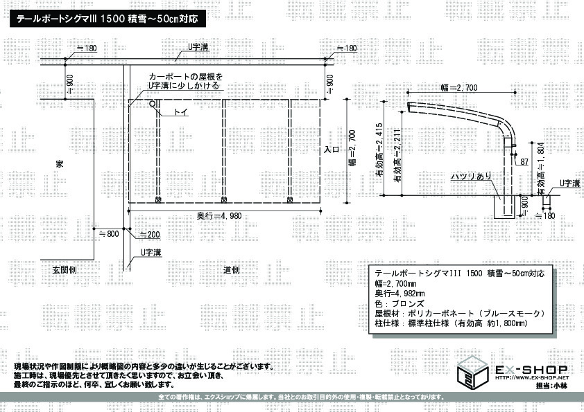 | 屋根材等 | ポリカーボネート(ブルースモーク) |