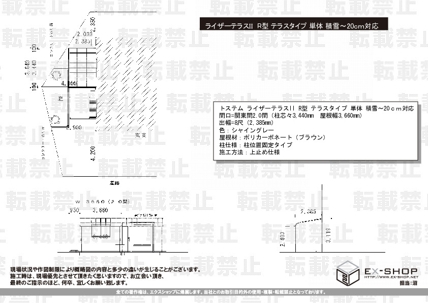 | サイズ | 屋根幅 3,660mm 出幅 2,385mm |