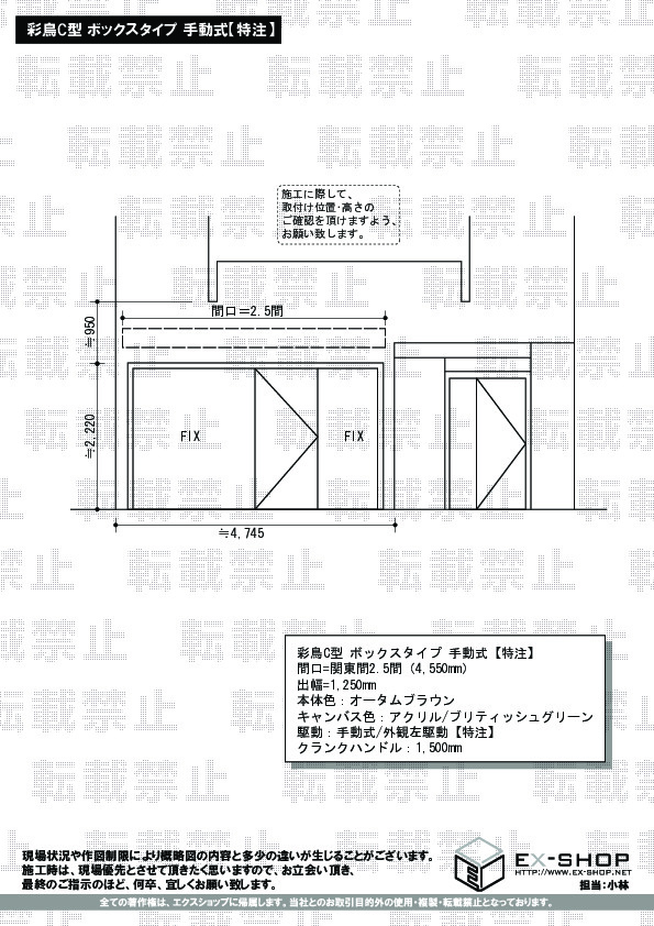 この度は、彩鳥C型 ボックスタイプ 手動式の施工をご依頼頂きまして、誠に有難うございます。ブリティッシュグリーンのキャンパス地が、お店の雰囲気にぴったりマッチして、知らず知らずに足を踏み入れたくなる素敵なお仕上がりでございますね。お客様のご希望に沿う形で、すべて進行することができましたことは、私どもにとりましても自信となりました。今後ますます精進して参りますので、また機会がございましたら、ぜひ弊社をご用命くださいますよう、お願い申し上げます。