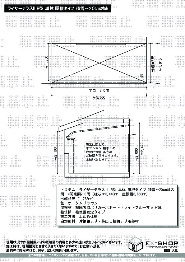 サイズ | 屋根幅 3,660mm 出幅 1,785mm |
