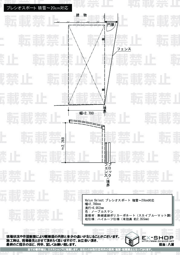 施工を伴う商品を、ネット販売でご依頼頂くにあたっては、ご不安に思われるのもごもっともだと存じます。少しでもお客様のご不安を和らげることができればと、メールやお電話でのきめ細かい対応に努め、お客さまから頂きます施工例を掲載させて頂いております。ご参考にして頂き、プレシオスポート の施工をご依頼頂きましたこと、大変光栄に存じます。弊社では、カーポート以外にも、様々なエクステリアをご用意致しておりますので、また、機会がございましたら、エクスショップにご用命くださりますよう宜しくお願い致します。この度のご利用、誠に有り難うございました。
