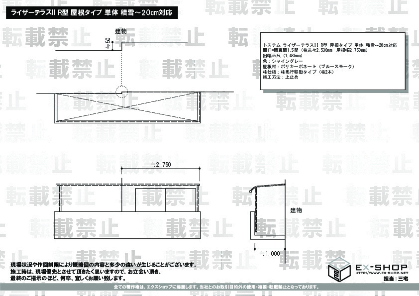 | サイズ | 屋根幅 2,750mm 出幅 1,485mm |