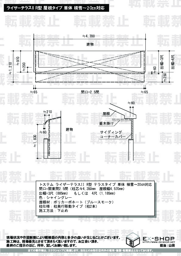 サイズ | 屋根幅 4,570mm 出幅 1,185mm |