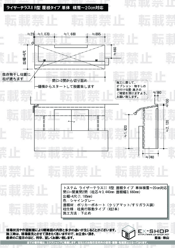 | サイズ | 屋根幅 3,660mm 出幅 1,185mm |
