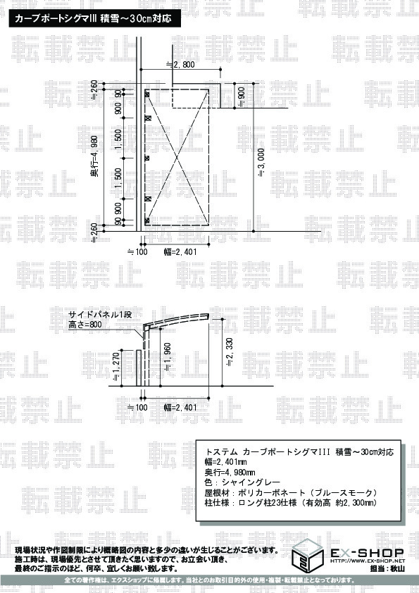 担当の方には感じ良く対応して頂き、また工事の方にも納得のいく説明をして頂きました。工事も一日で終わり大変助かりました。高く大きめの物にしたおかげで、大きな車も余裕を持って置けています。エクスショップさんにして良かったと思います!