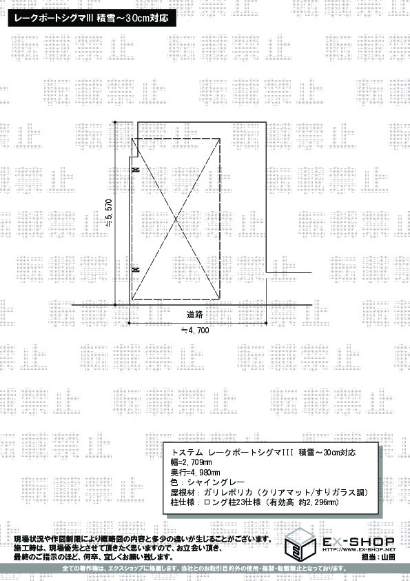 提携施工店をはじめ、弊社対応に嬉しいお褒めの言葉を頂き、誠に有り難うございます。シンプルなレークポートシグマVが綺麗に納まり、美しいお仕上がりでございますね。屋根材のガリレポリカ(クリアマット/すりガラス調)が明るい光を通し、大切なお車を、雨風からしっかりお守りしますので、快適にご利用頂けることと存じます。今後も、格安かつ最高品質な商品をご提供出来ますよう、試行錯誤を重ねて参ります。またエクステリアの施工をお考えの際は、エクスショップをご用命くださいますよう、宜しくお願い致します。