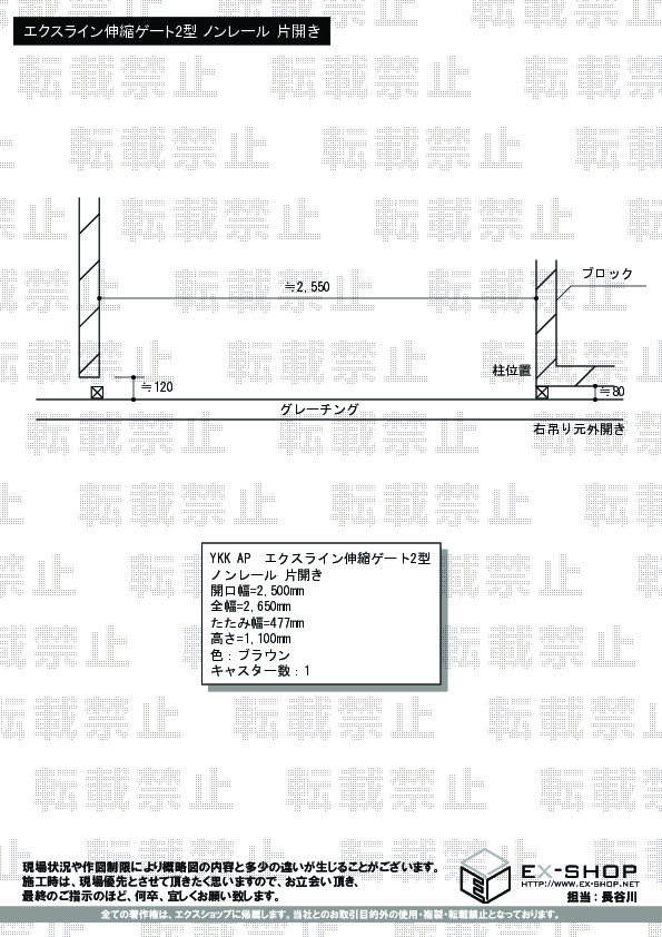 施工を伴います商品を、顔の見えないネットショッピングでご依頼頂くにあたりましては、ご不安に思われることも多かったかと存じますが、弊社を信頼してご用命下さり、誠に有り難うございます。エクスライン伸縮ゲートは、本体を小さくたたみ全開にした後、さらに家屋側は回転収納することが出来ますので、さらに便利にお使い頂けるものと存じます。今後は、丁寧な対応とともに、スピードの面でもご満足頂けますよう、努力して参りたいと存じます。また機会がございましたら、是非エクスショップにご用命くださいますよう、宜しくお願い致します。