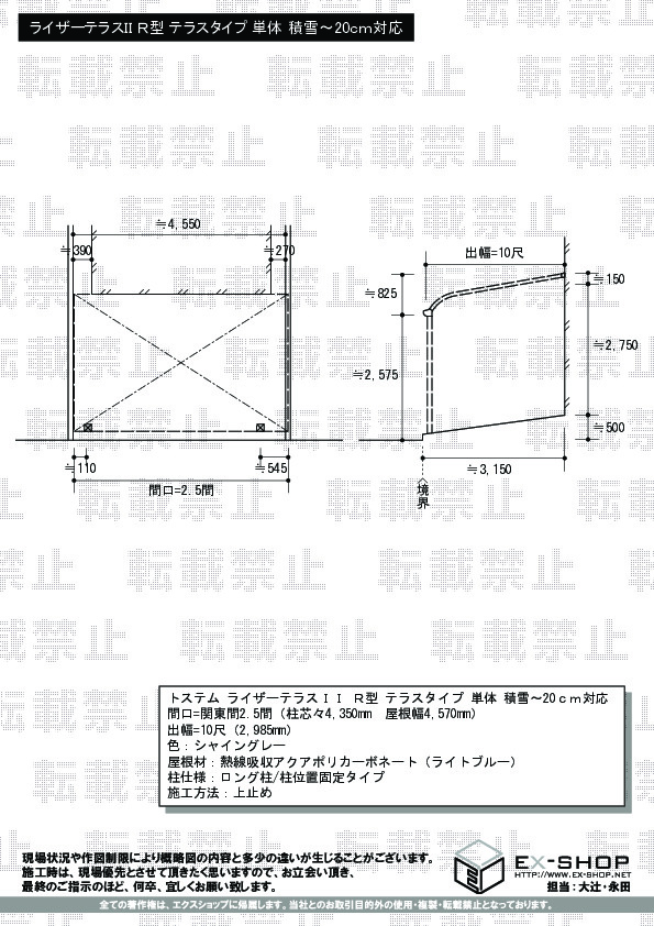 サイズ | 屋根幅 4,570mm 出幅 2,985mm |