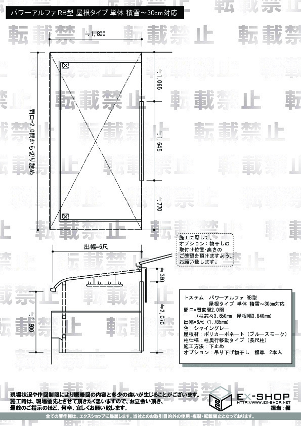 | サイズ | 屋根幅 3,840mm 出幅 1,785mm |