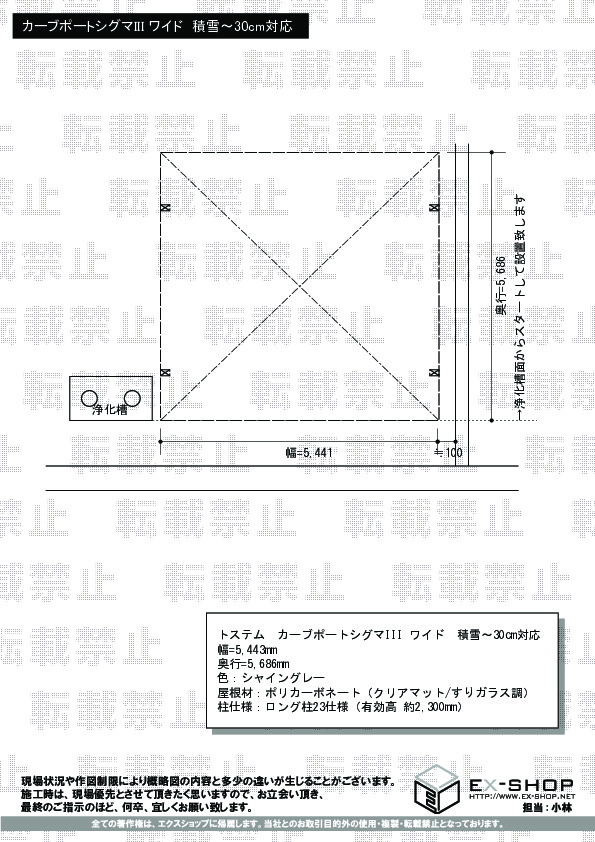 幅=3,624mm 奥行=5,686mm 色:シャイングレー 屋根材:ポリカーボネート(クリアブラウン) 柱仕様:標準柱仕様(有効高 約2,200mm)