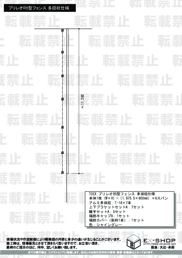 この度はエクスショップをご利用頂きまして、誠に有難うございます。シャイングレーのプリレオR5型フェンスは、上品で高級感のあるお仕上がりでございますね。担当者の変更により、お客様にご迷惑をおかけしてしまい、申し訳ございませんでした。お客様のご意見を真摯に受け止め、見積り内容等につきましても、提携施工店とも協議を重ねて参りたいと存じます。今後も変わらず、お客様のご満足の為に精進して参りたいと存じますので、また何かございましたらご遠慮なくエクスショップまでご連絡ください。この度のご利用、誠に有り難うございました。