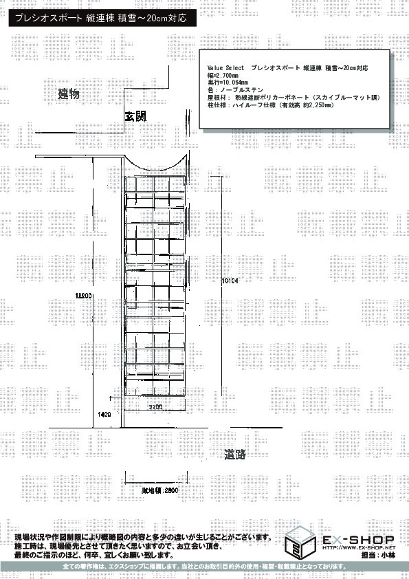 この度はエクスショップをご利用頂きまして誠に有難うございました。さすが縦連棟のカーポートなので奥行があり、とても立派でございますね。プレシオスポートもメーカーものに劣らないくらいの性能を持っておりますので、永らくご愛用頂けるものと存じます。ご近所へのお声掛けの件ですが、お客様に不安を与えませんよう心がけてはおりますが、万が一挨拶がなかったということのないように、今後改善策を考えて参ります。貴重なご意見有難うございます。また、機会がございましたらスタッフ一同心よりお待ちしておりますので、お気軽にエクスショップをご利用下さいませ。